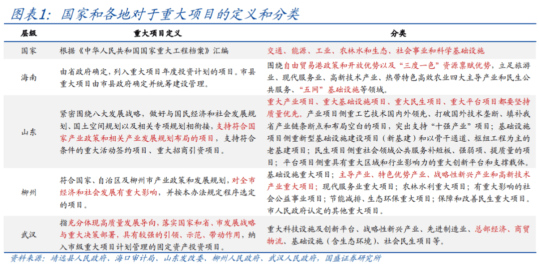 从分类看,重大项目也尚未有固定的分类标准,并根据国家战略变化、不断充实其内涵。目前各地分类也不尽相同,根据山东、海南、柳州等地出台的重大项目管理办法,重大项目分类上,共性在于,一般都包括重大基础设施项目、重大产业项目、重大民生项目、重大生态项目等;个性在于,各地根据地区发展规划相应谋划具有地方特色的重大项目,如海南提出“围绕自由贸易港政策和开放优势以及‘三度一色’资源禀赋优势”,武汉在传统基建、科技、产业外,提出要谋划总部经济、商贸物流重大项目。
