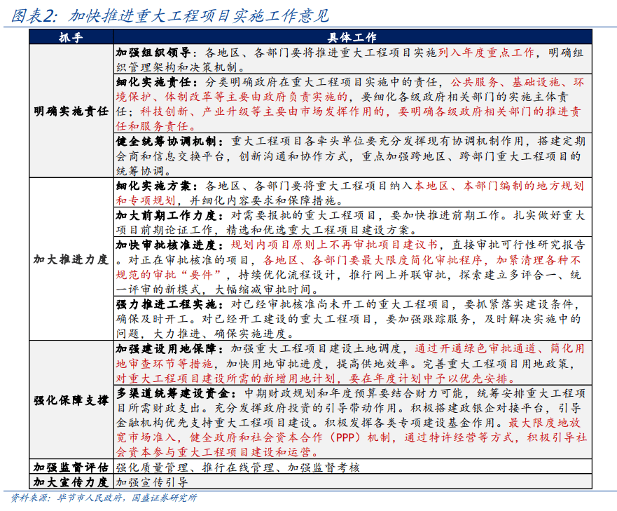 特征看,重大项目往往具备政策实施层面的确定性和牵引性,即作为五年规划落地实施的关键抓手,重大项目直接反映国家至少未来五年的战略重心,具备长期稳定的政策预期。此外,重大项目牵动了一批重大政策,如“十三五”期间发改委发布了《关于加快推进国家“十三五”规划重大工程项目实施工作的意见》,以保障重大项目加快实施,举措包括:1)分部门、分地区、分年度“认领”重大项目推进工作;2)最大限度加快审批、实施,未开工的抓紧开工、已开工的抓紧跟踪进度;3)强化土地、资金等配套保障,优先安排。